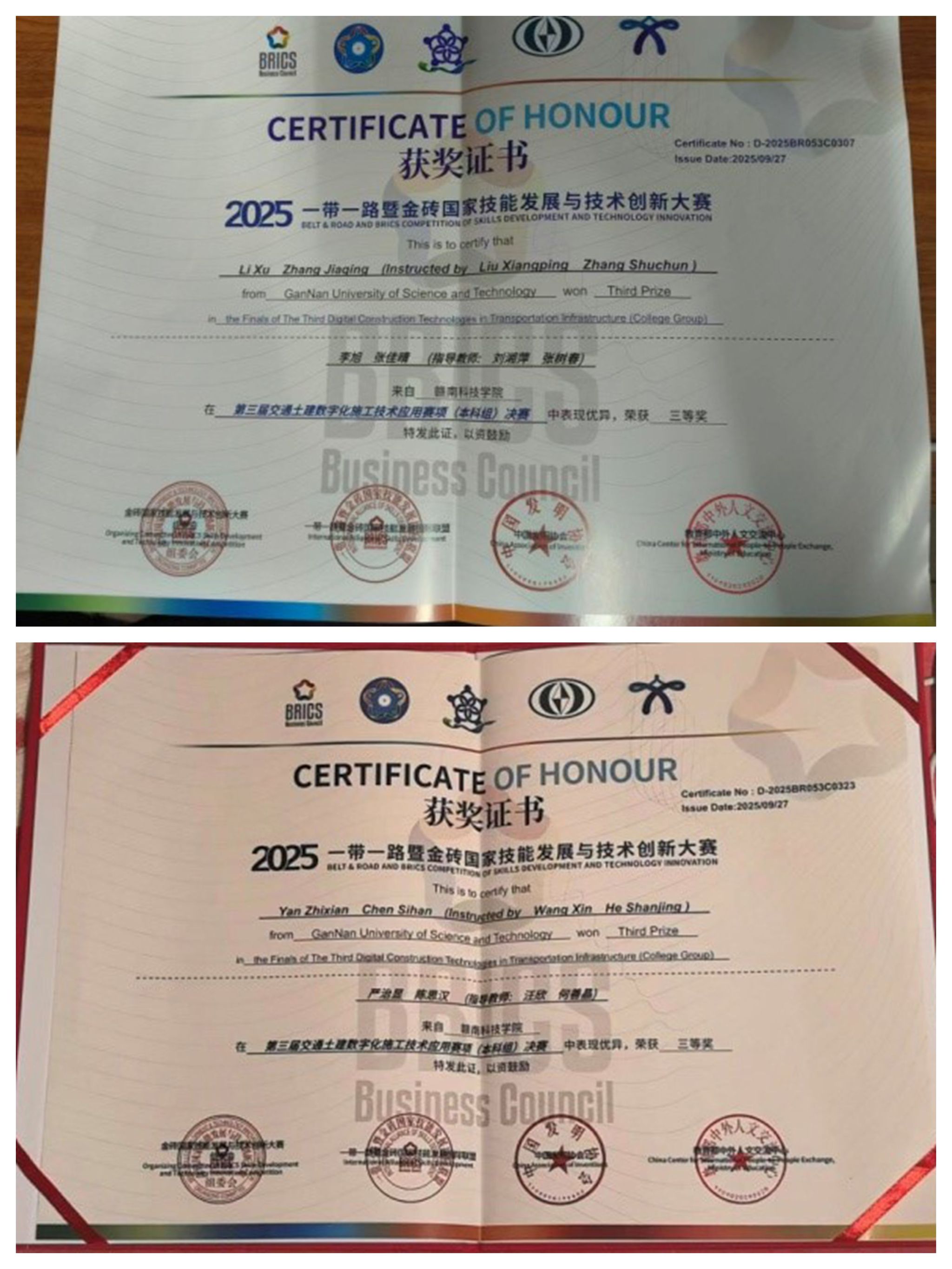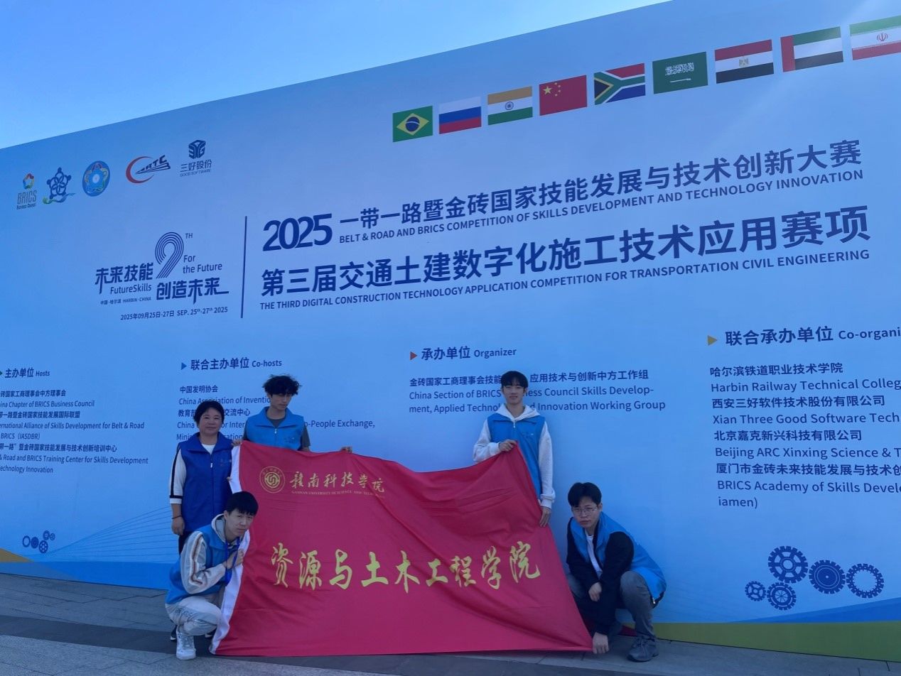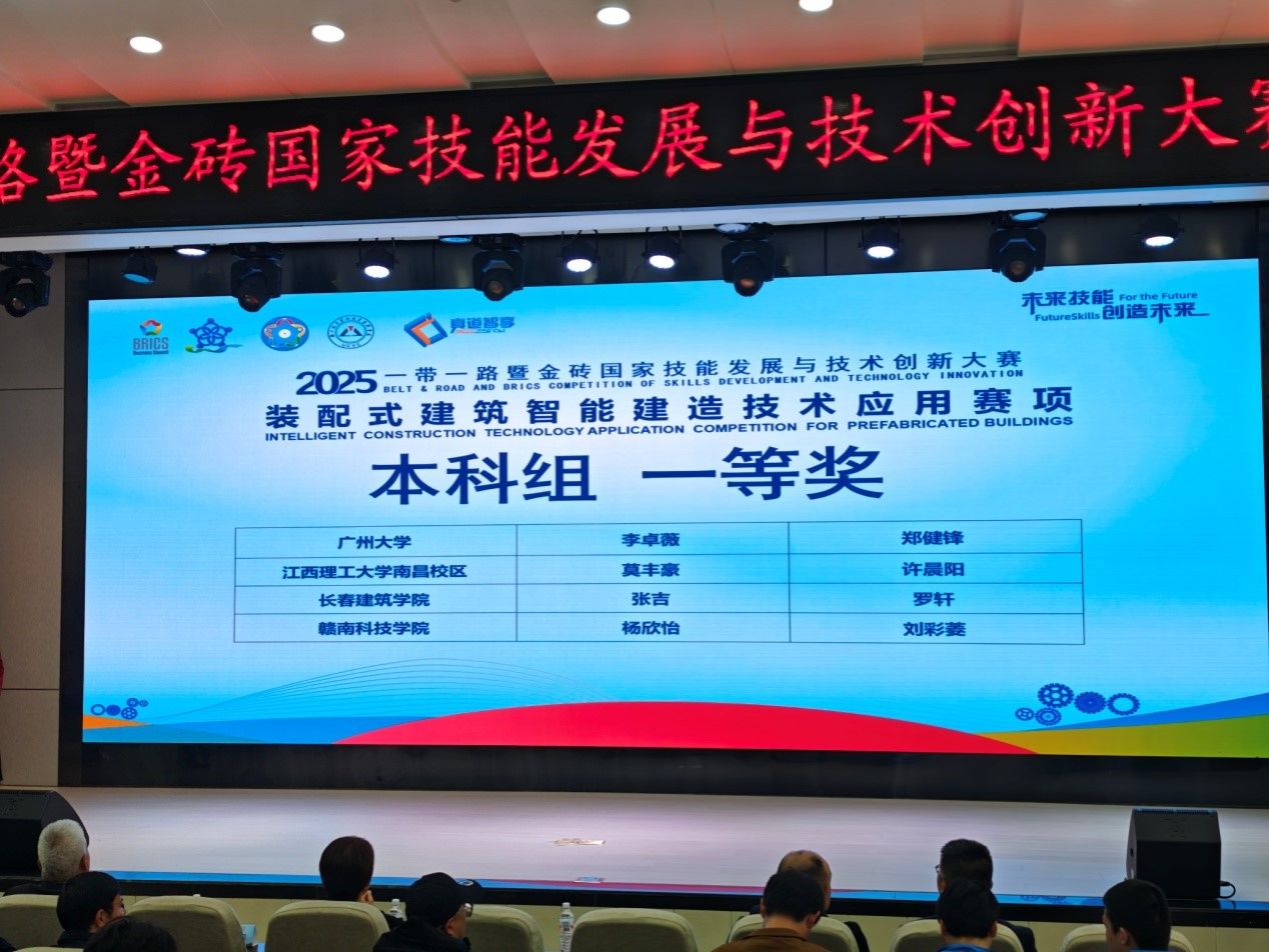 本网讯:近日,由金砖国家工商理事会中方理事会、“一带一路”暨金砖国家技能发展国际联盟、“一带一路”暨金砖国家技能发展与技术创新培训中心主办的2025“一带一路”暨金砖国家技能发展与技术创新大赛第三届交通土建数字化施工技术应用赛项全国总决赛、装配式建筑智能建造技术应用赛项全国总决赛先后在哈尔滨、武汉举办,我校资源与土木工程学院学子表现出色、捷报频传。