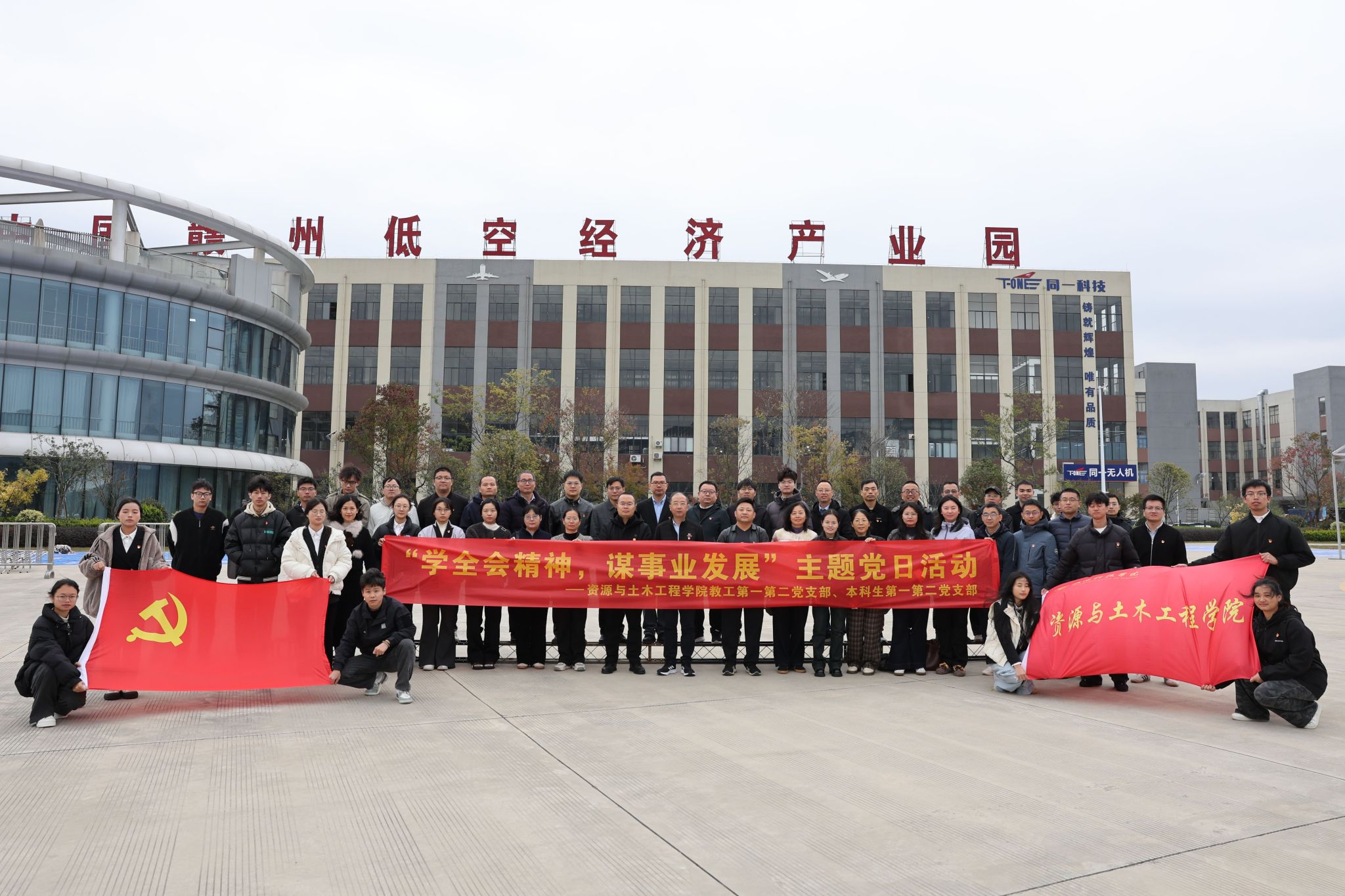 本网讯:11月18日,资源与土木工程学院党委组织学院教工第一、第二党支部,本科生第一、第二党支部走进赣州低空经济产业园南康航空小镇开展“学全会精神,谋事业发展”11月份主题党日活动。活动聚焦党的二十届四中全会精神学习与低空经济发展实践探索,采用“现场参观研学+集中理论学习+交流研讨实践”的形式,沉浸式感受新兴产业发展活力,推动理论学习与实践探索深度融合,着力打造政治坚定、务实创新、勇担使命的先进党组织。资源与土木工程学院教师党员、本科生党员及入党积极分子代表参加此次活动。