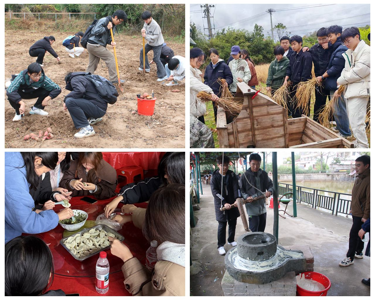 在劳动实践阶段,同学们满怀热忱投身各项劳动实践任务,踏入稻田挥镰割稻,锄挖红薯、走进厨房包饺子、动手炒菜,在汗水中体悟农民耕种的艰辛,进一步筑牢珍惜粮食的意识;在体验手磨豆浆的过程中,了解豆浆制作工艺,增长劳作知识。在体能锻炼阶段,同学们进行拔河、铁锹接力跑等心理素质拓展活动,在劳动教育和实践锻炼中强思想、长才干、壮筋骨,促进身心健康成长,提高综合素质能力。