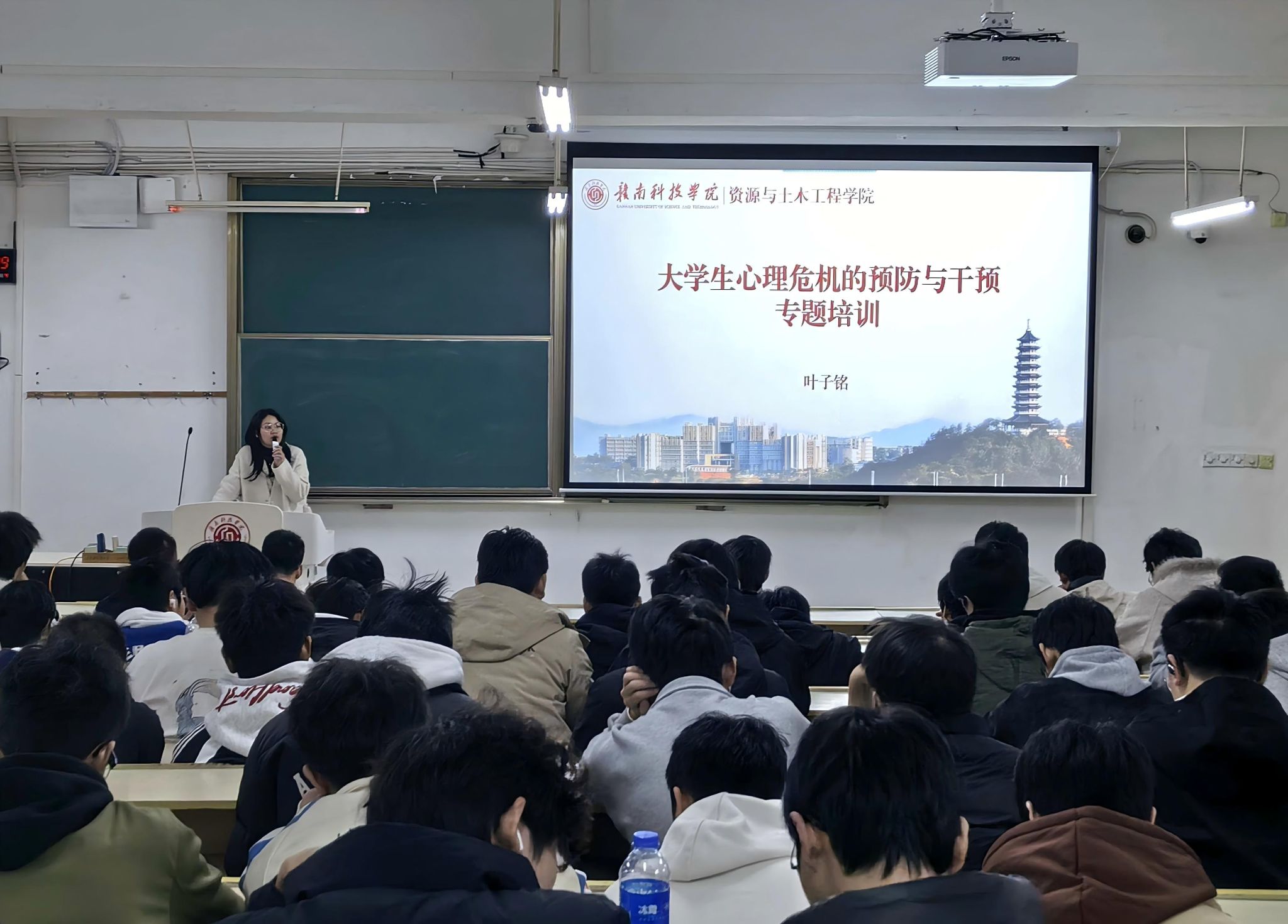 本网讯:为进一步夯实学院基层心理工作队伍建设根基,切实提升学生干部的心理危机识别能力、助人服务素养与责任担当意识,11月20日晚,资源与土木工程学院面向全体班级心理委员、寝室心理联络员,在崇善楼Z1D2教室举办大学生心理危机的预防和干预专题培训。