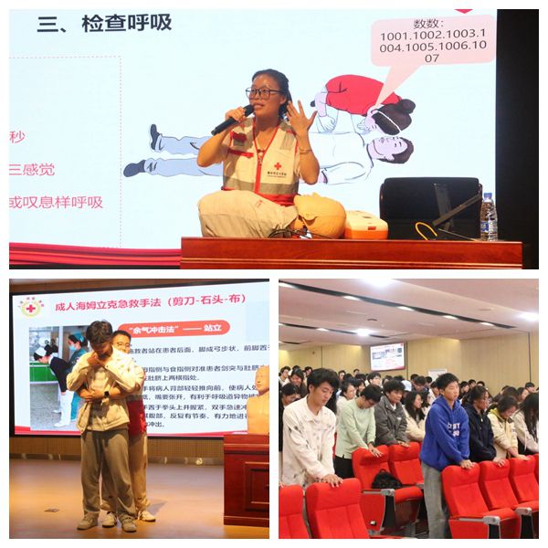现场还设置互动问答与模拟实操环节,学生们踊跃参与,在红十字志愿者的协助下完成心肺复苏与海姆立克手法的实践练习,进一步巩固了所学知识,提升应急处理能力。