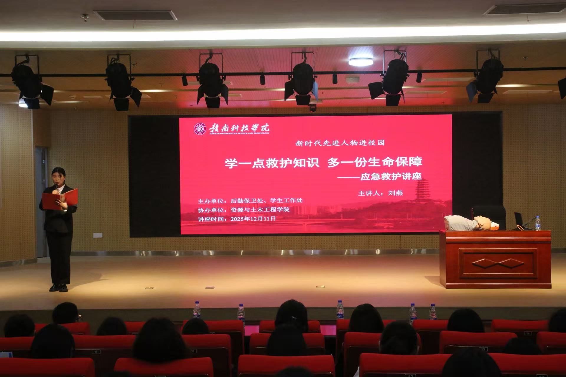 本网讯:12月11日晚,我校邀请江西省新时代赣鄱先锋、赣州市红十字会刘燕副教授在大学生活动中心报告厅开展讲座。资源与土木工程学院党委委员、学工办主任涂黎明、后勤保卫处教师代表、辅导员、各学院班长及生活委员、资源与土木工程学院团委学生会学生干部、资源与土木工程学院“资小青”青年志愿服务队共计300余名师生聆听了专题讲座。此次“新时代先进人物进校园——应急救护普及培训”专题讲座由后勤保卫处、学生工作处联合主办,资源与土木工程学院承办。