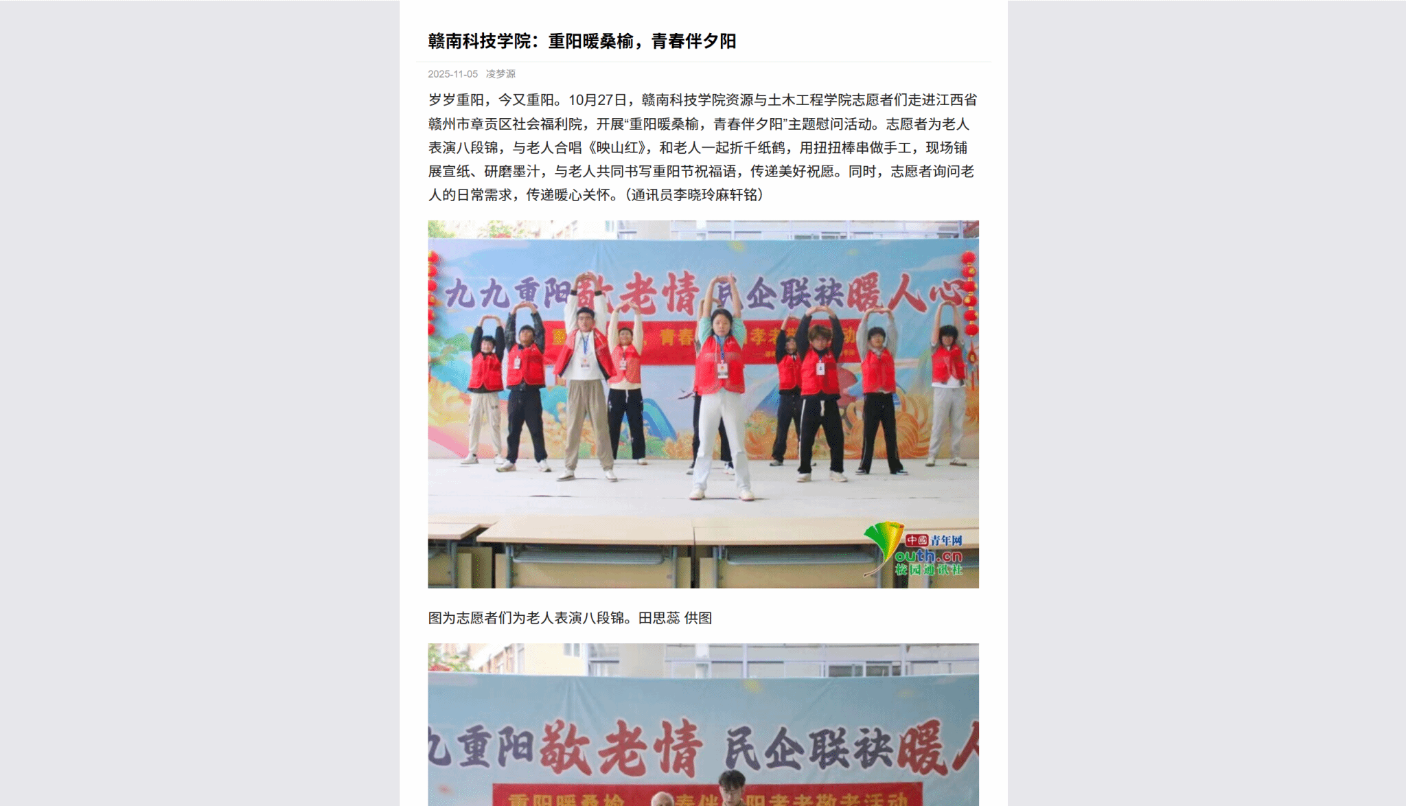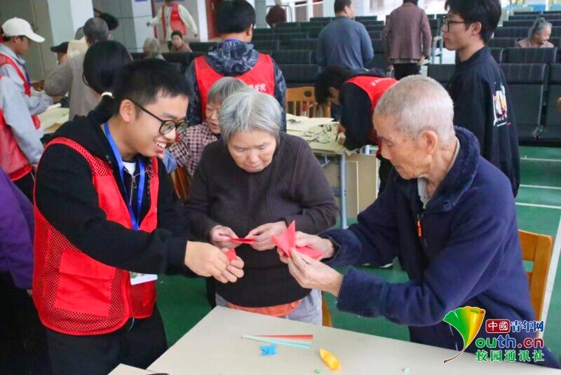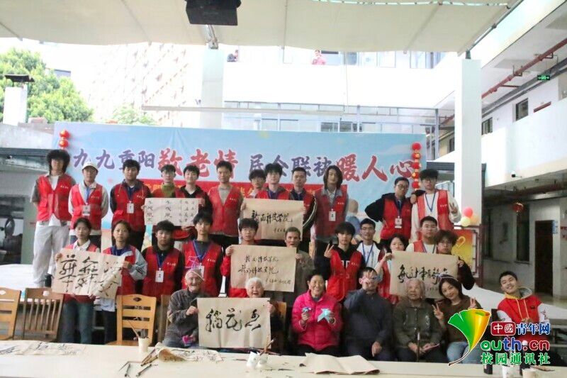 岁岁重阳,今又重阳。10月27日,赣南科技学院资源与土木工程学院志愿者们走进江西省赣州市章贡区社会福利院,开展“重阳暖桑榆,青春伴夕阳”主题慰问活动。志愿者为老人表演八段锦,与老人合唱《映山红》,和老人一起折千纸鹤,用扭扭棒串做手工,现场铺展宣纸、研磨墨汁,与老人共同书写重阳节祝福语,传递美好祝愿。同时,志愿者询问老人的日常需求,传递暖心关怀。(通讯员李晓玲麻轩铭)