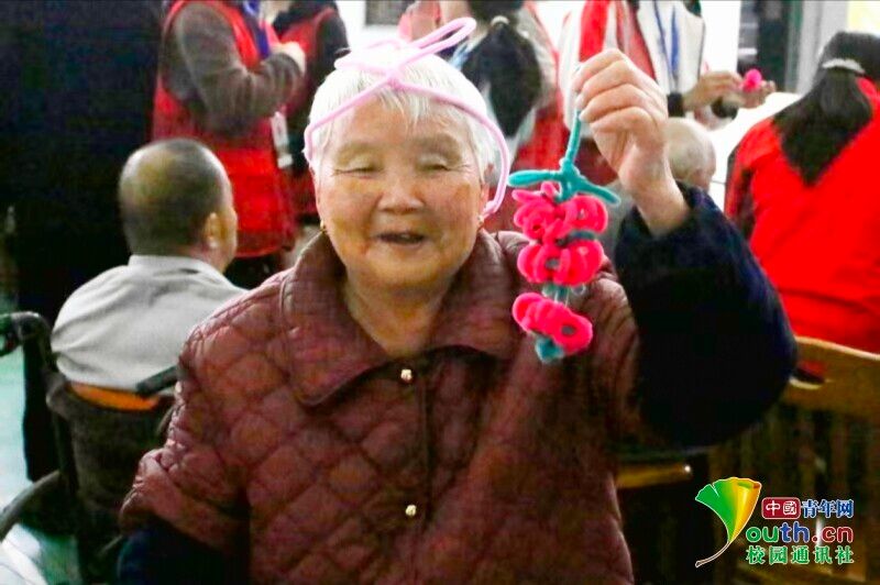 图为老人展示自己的扭扭棒作品。田思蕊 供图