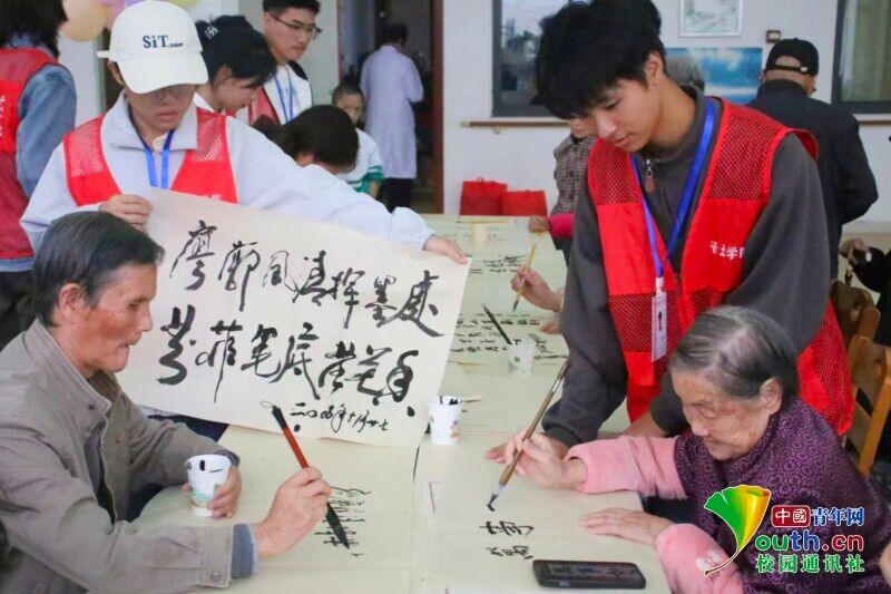 图为志愿者协助老人用毛笔写下重阳节祝福语。田思蕊 供图
