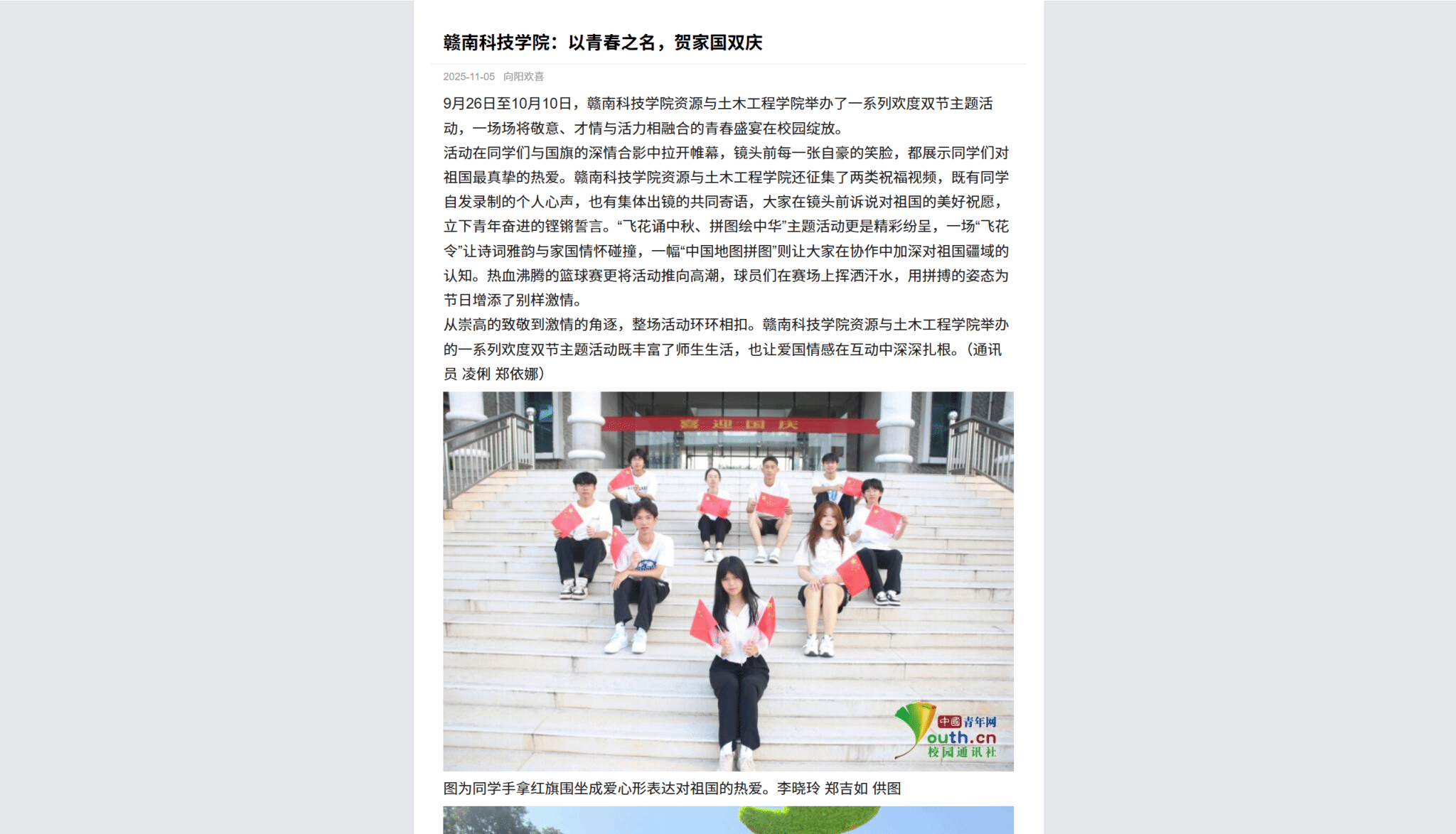 9月26日至10月10日,赣南科技学院资源与土木工程学院举办了一系列欢度双节主题活动,一场场将敬意、才情与活力相融合的青春盛宴在校园绽放。