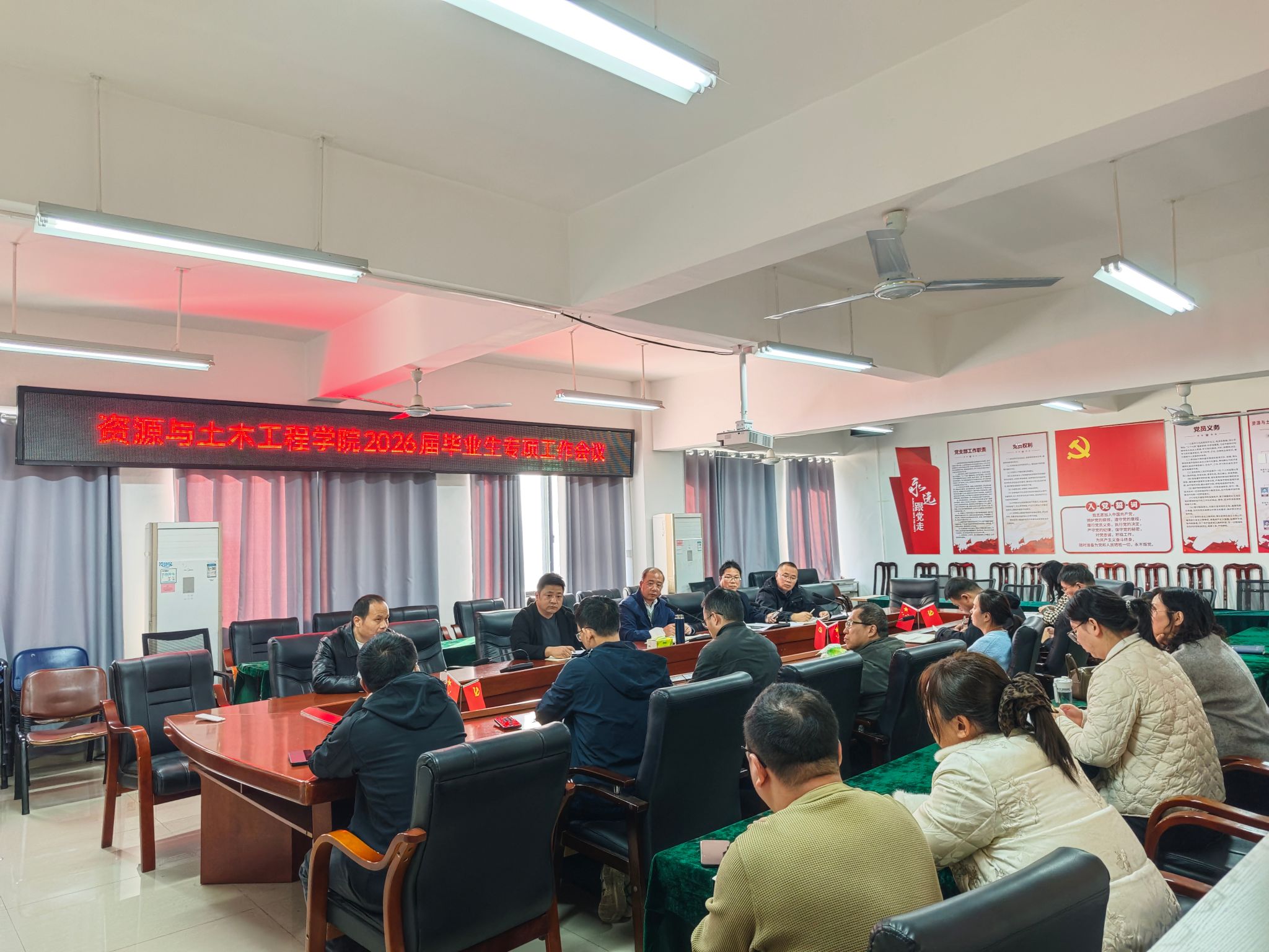 本网讯:为全面掌握2026届毕业年级工作推进情况,聚焦就业创业、学业帮扶、日常管理等核心任务中的重点难点问题,科学谋划下一阶段工作举措,11月25日下午,资源与土木工程学院在逸夫楼A505召开2026届毕业生专项工作会议。学院党委书记刘俊峰、领导班子成员、各教研室主任、2022级辅导员、就业辅导员、2022级全体班主任及2021级班主任代表参加会议,会议由学院党委委员、学工办主任涂黎明主持。